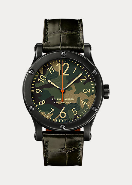 The 45 mm Chronometer Steel watch celebrates the spirit of travel and adventure, effortlessly melding utilitarian design with rugged details. With a COSC-certified chronometer, a camouflage-patterned dial, and oversized Arabic numerals, the blackened stainless steel timepiece is perfect for modern explorers.