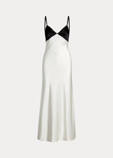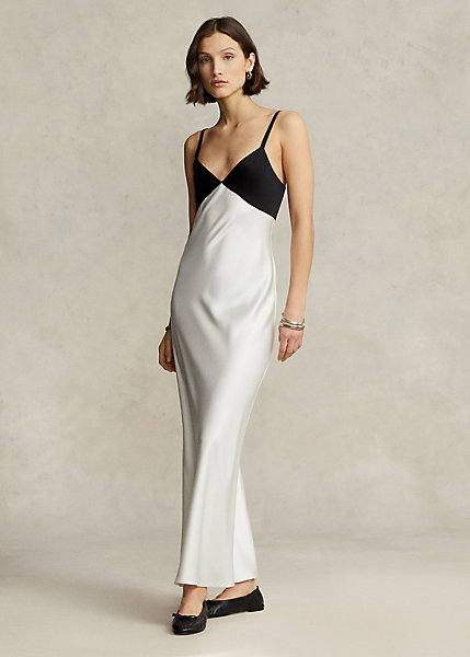 An elegant choice for evening, this gown is crafted with lustrous satin and cut for a fluid fit-and-flare silhouette featuring a contrast paneled bust.