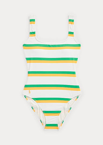 This one-piece unites a tennis-inspired striped motif with a deep scoopback and our signature embroidered Pony.